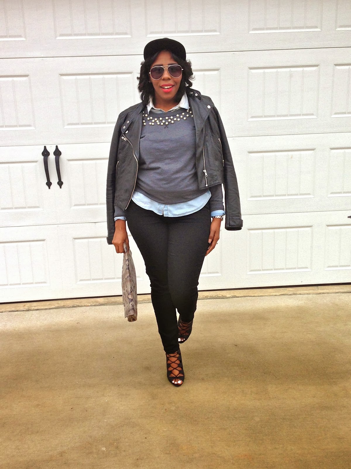 Gray Sweatshirt: Old Navy, Black Rockstar Skinny Jeans: Old Navy, Denim Button Up: Target, Leather Jacket: H&M, Lace - Up Booties: Charlotte Russe, Snakeskin Clutch: Target, Sunnies: Aldo, MK Watch: Macy's, and NY Baseball Cap: Hubby's