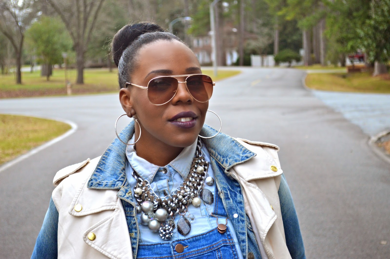 Outfit Details: Denim Overalls (Macy's), Denim Shirt (Target), Denim Jacket (Forever 21), Leather Vest (Forever 21), Pumps (Forever 21), Aviators (H&M)