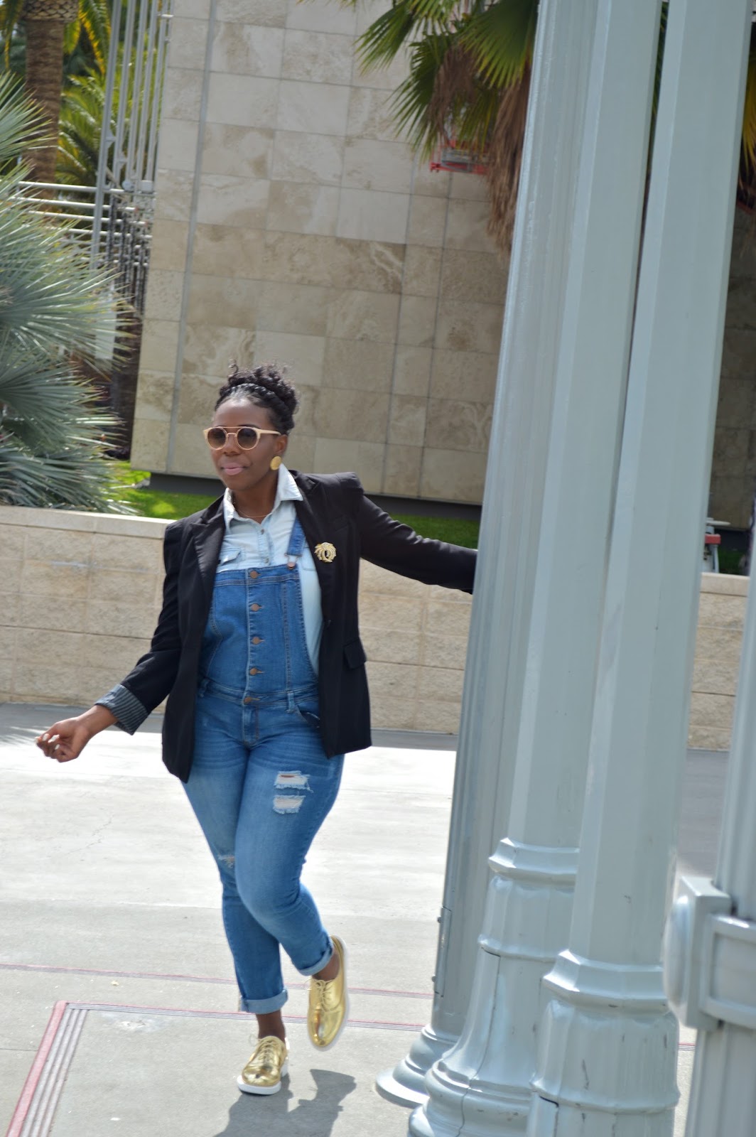 Overalls (Macy's), Denim Button Up (Target), Boyfriend Blazer (Forever 21), Golden Oxfords (Zara), Sunnies (Forever 21), Watch (Charming Charlie's), Earrings (Thrifted)